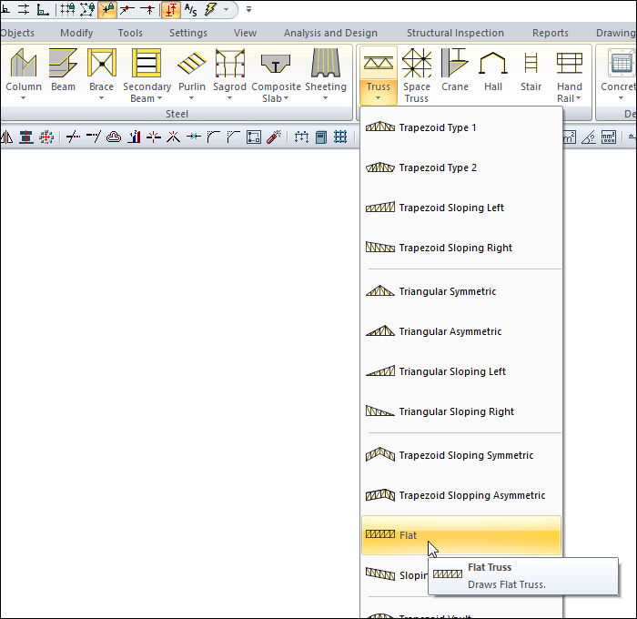 With the Flat command, the flat truss type, which is one of the prepared truss types, si drawn quickly. Truss heights are adjusted from its settings.