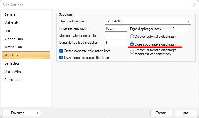 In order to model a flexible diaphragm, the option to Does not create a diaphragm is selected from the Slab Settings dialog .
