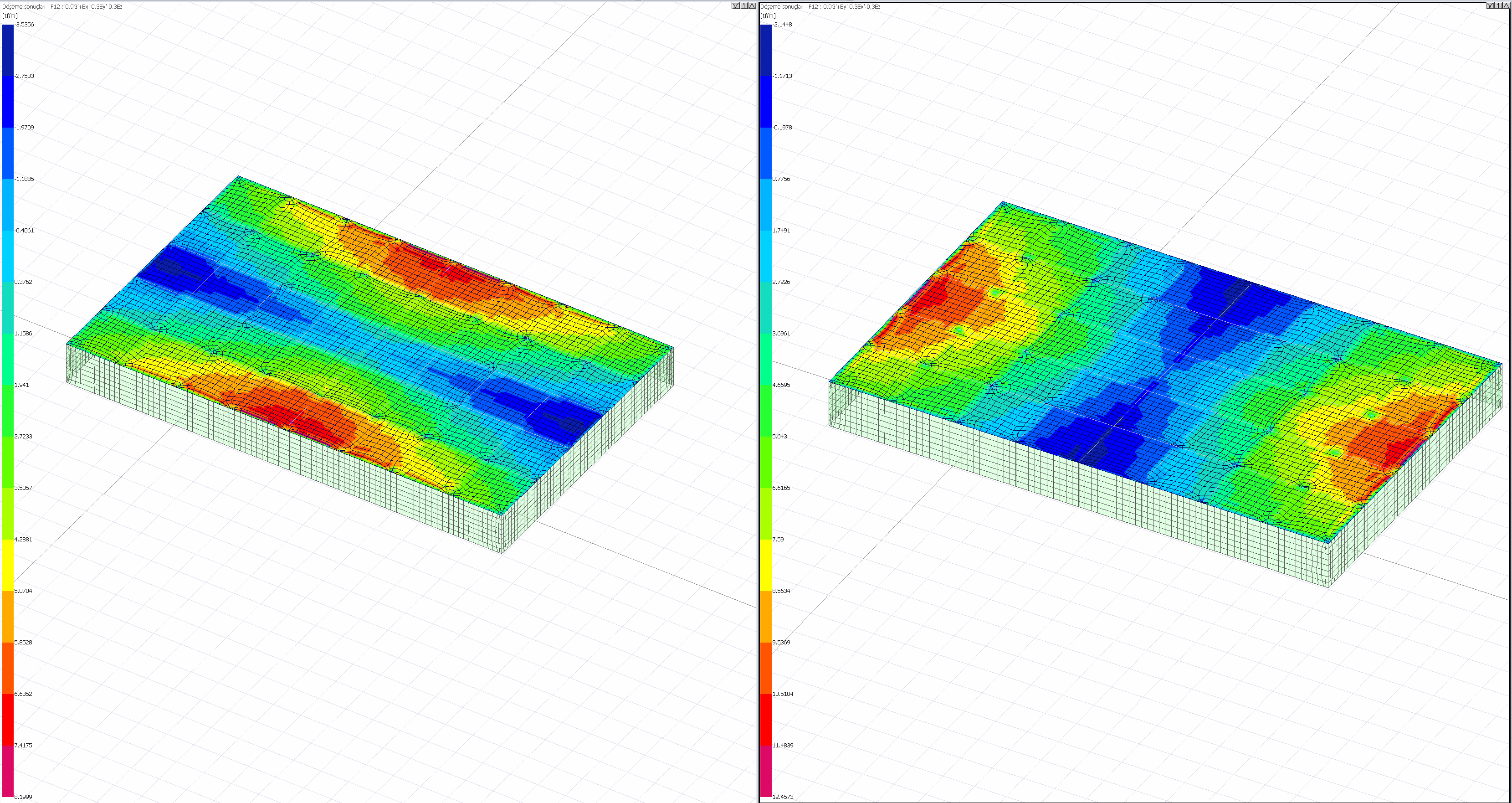 The floors here are solved with semi-rigid diaphragm acceptance and the floors are modeled with two-dimensional finite elements. As can be seen, the floors near the rigid perimeter walls received higher shear stresses. All floors including transition floors are checked and reported with the earthquake force calculation to be transferred in strong direction from the floor to the curtain or to the curtain arm calculated by using TBDY Article 7.11.5 and the Slab Stress Controls calculated using the Article 7.11.3 of TBDY .