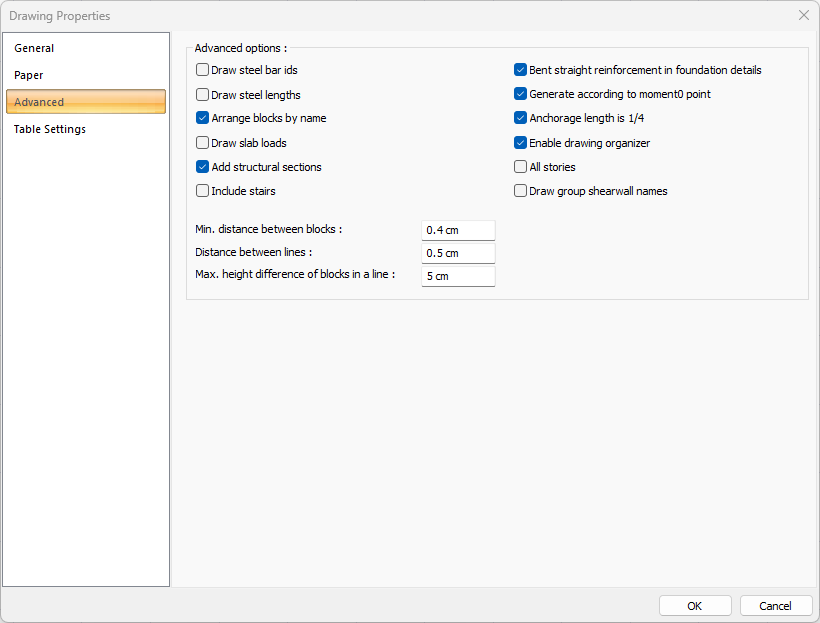 Distance between lines ![]() Minimum vertical distance between blocks is entered. The block is each opening itself, with its rebars, sections and dimensioning. |