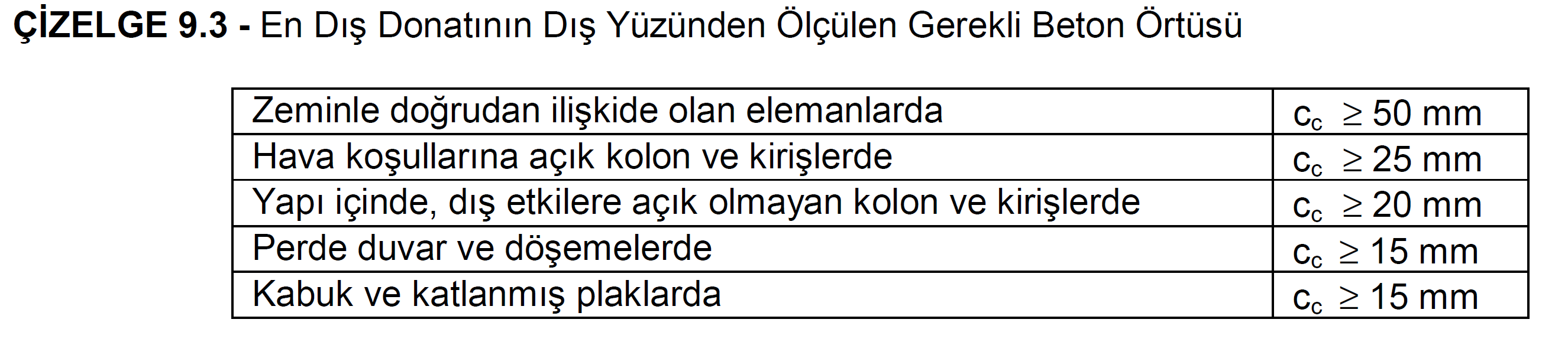 While applying the concrete cover control, 9.3 is taken into consideration in the Schedule given in TS 500, Article 9.5.1 . Therefore, in continuous foundations, the net concrete cover should be c c ≥ 50 mm.