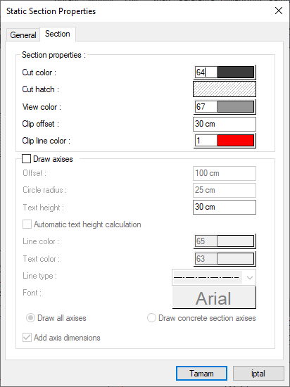 Draw axises ![]() It is the option that determines whether the axes that cut the section plane are shown in the section. When the option is selected, the axes are shown in section. |
