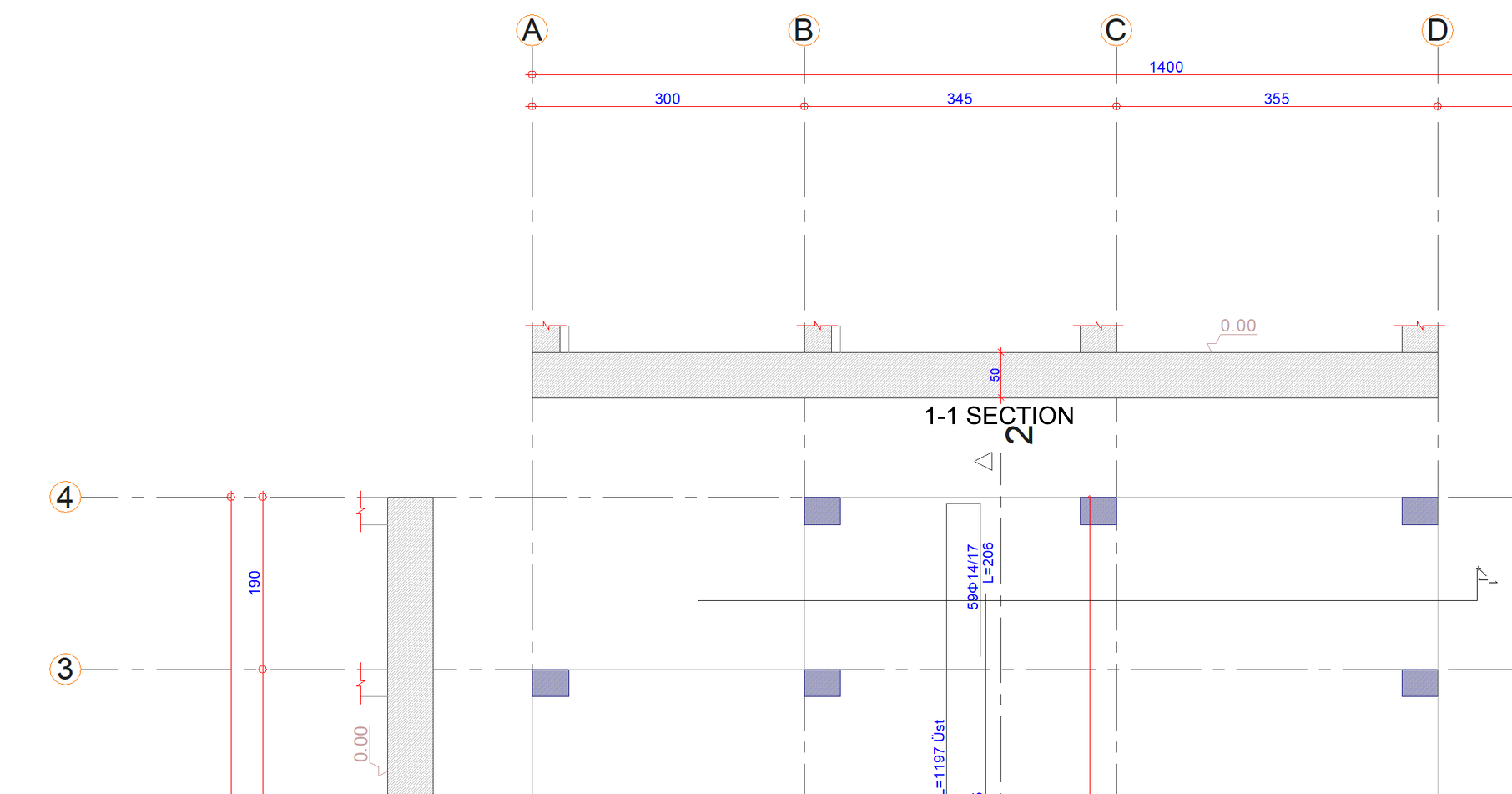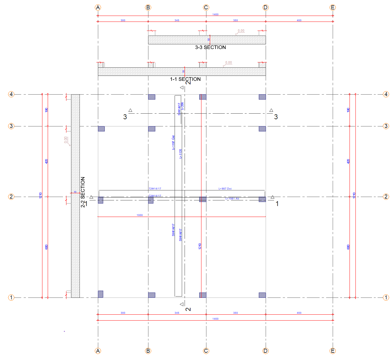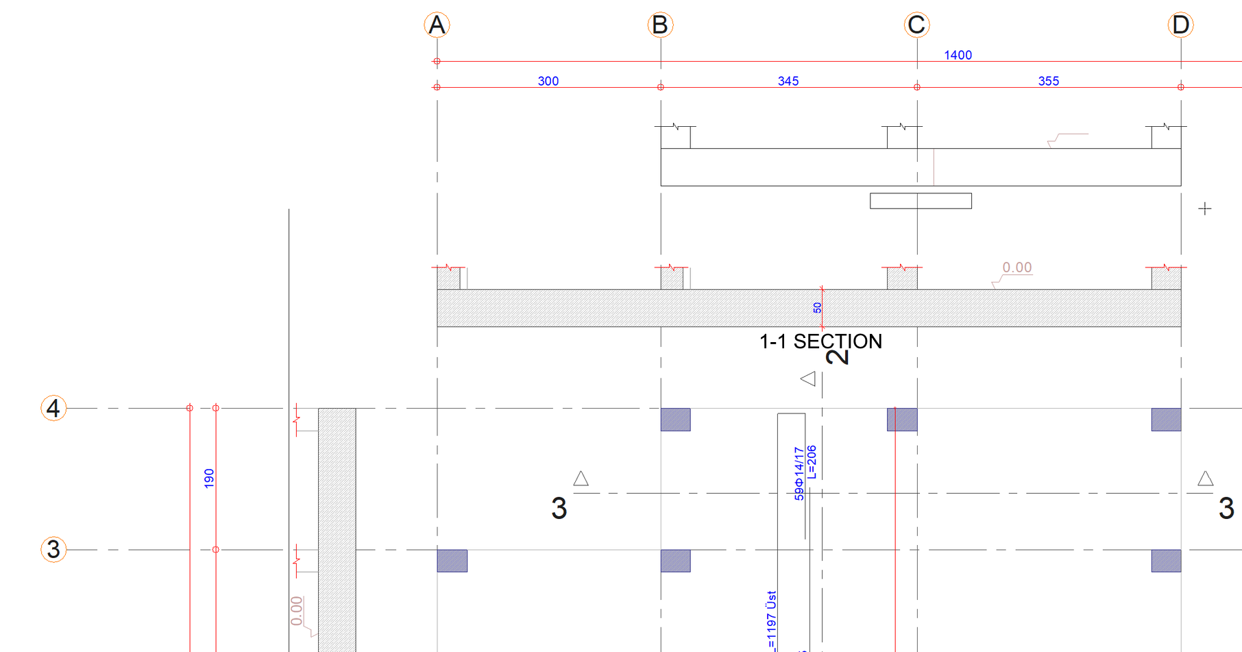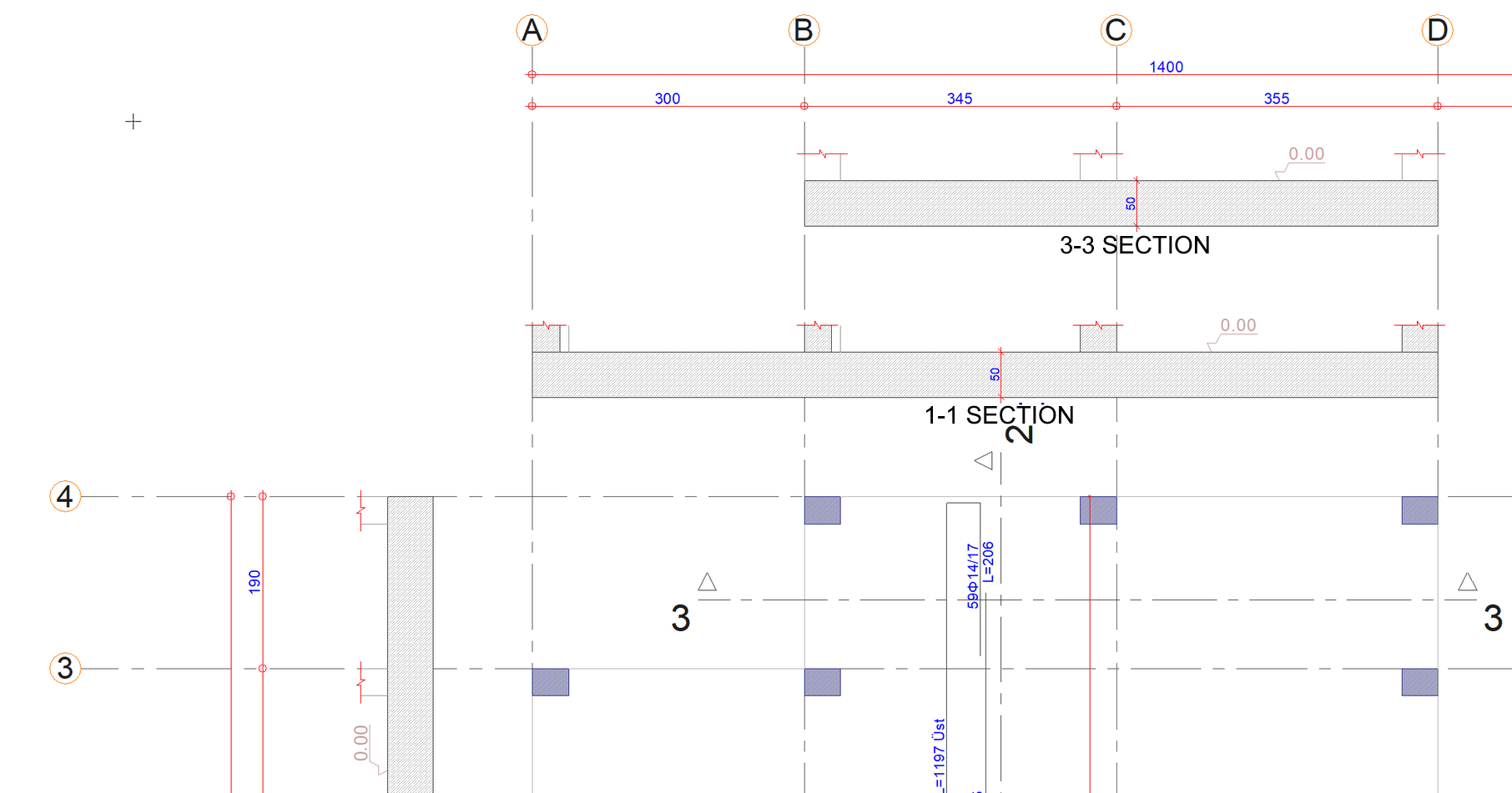 The foundation plan section will be prepared automatically while creating the foundation plan, or after the foundation plan is created, the section line can be created in the wanted number. Automatic creation of the foundation plan section while receiving the foundation plan depends on the Add structural sections option in the Drawing Properties dialog.