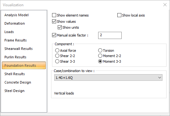 Case/combination to view ![]() By selecting the appropriate load combination from the list, the internal forces generated in the foundations due to this combination, selected in the component tab, can be graphically examined on the structure. |