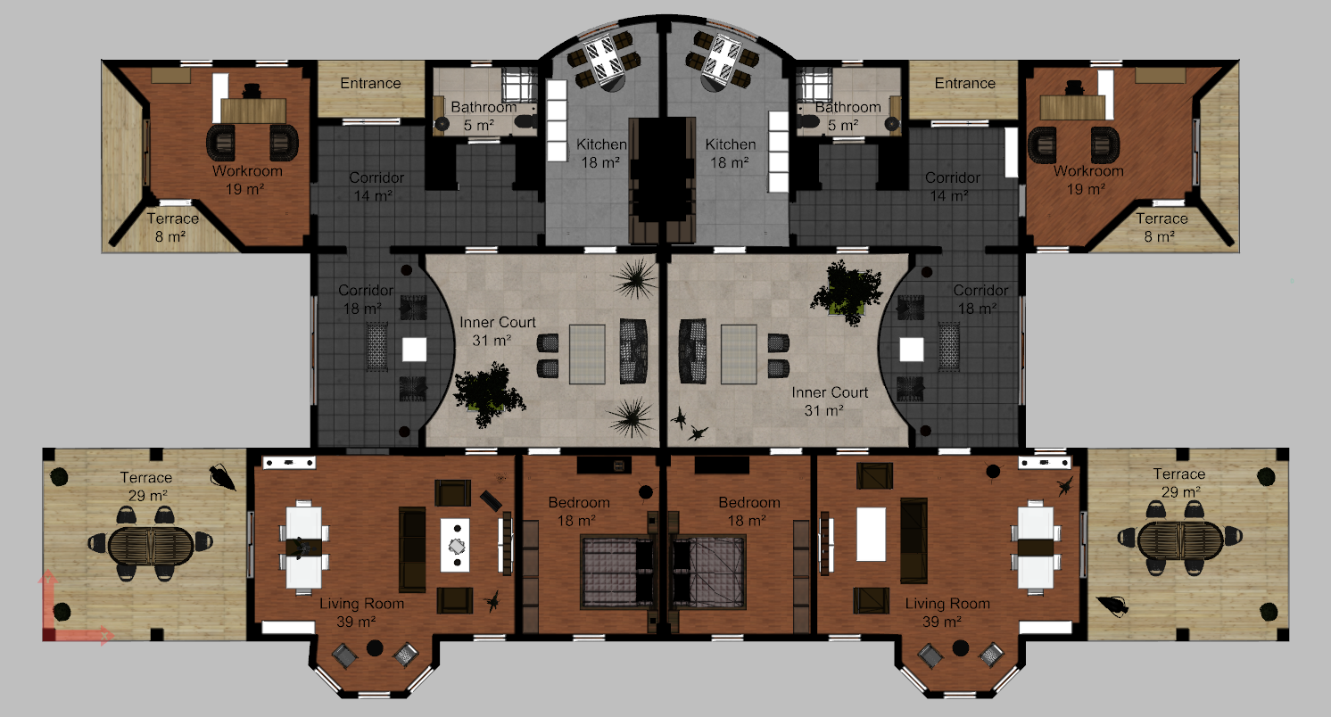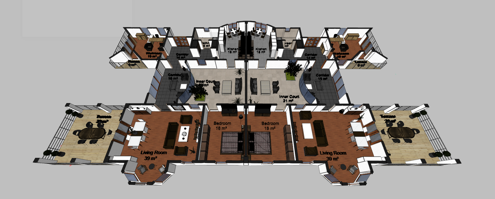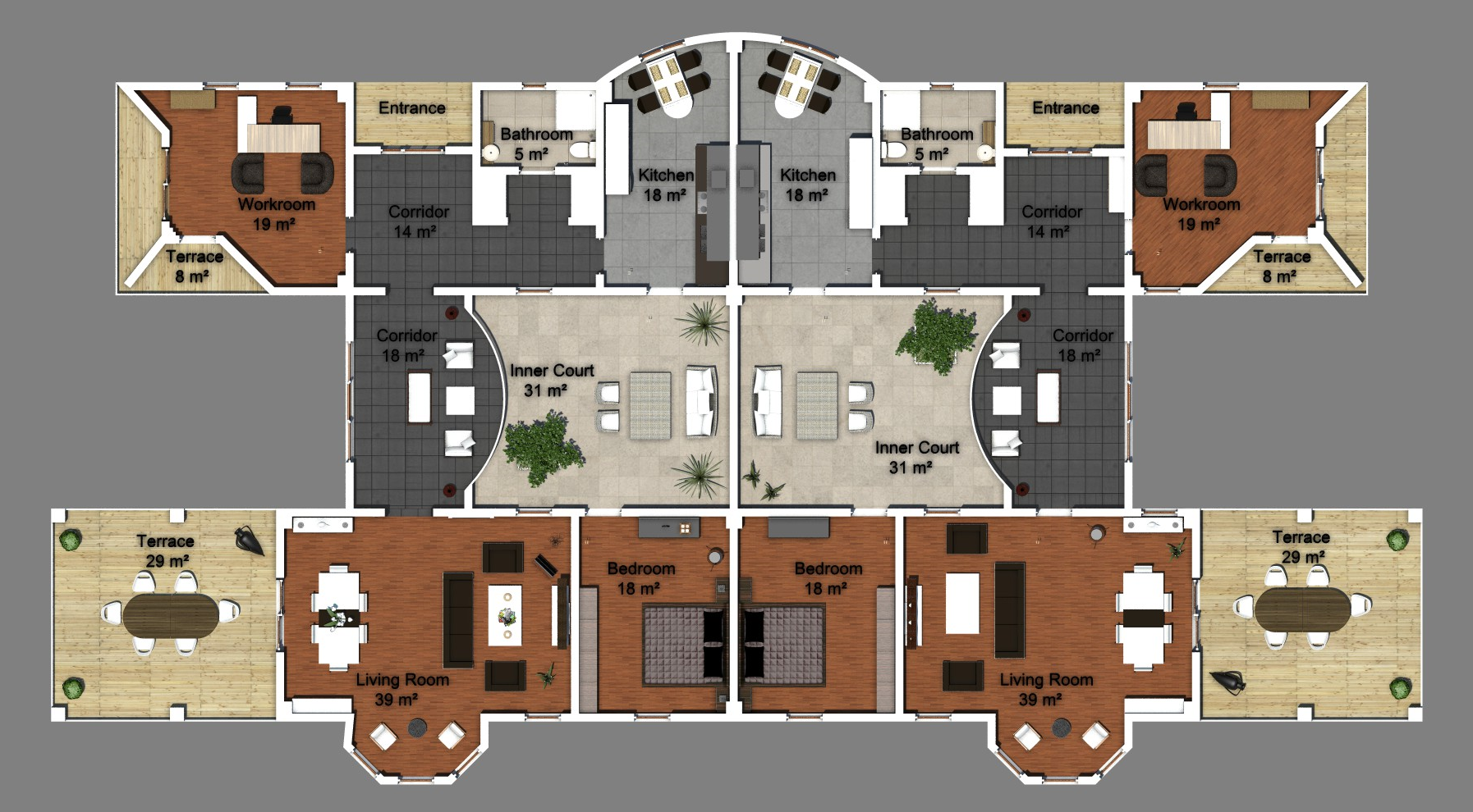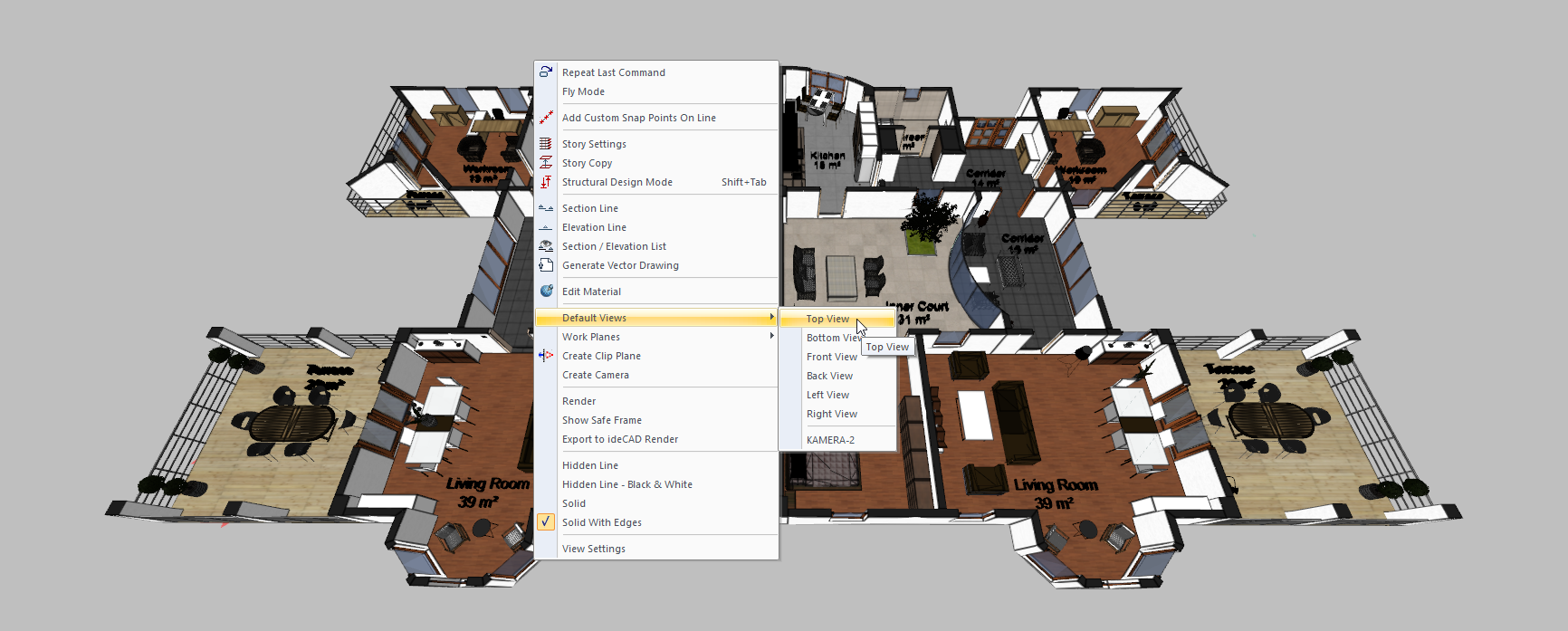 If you want the zone names and square meters to be included in your furnished story plan, add the information by using the 3D text command.