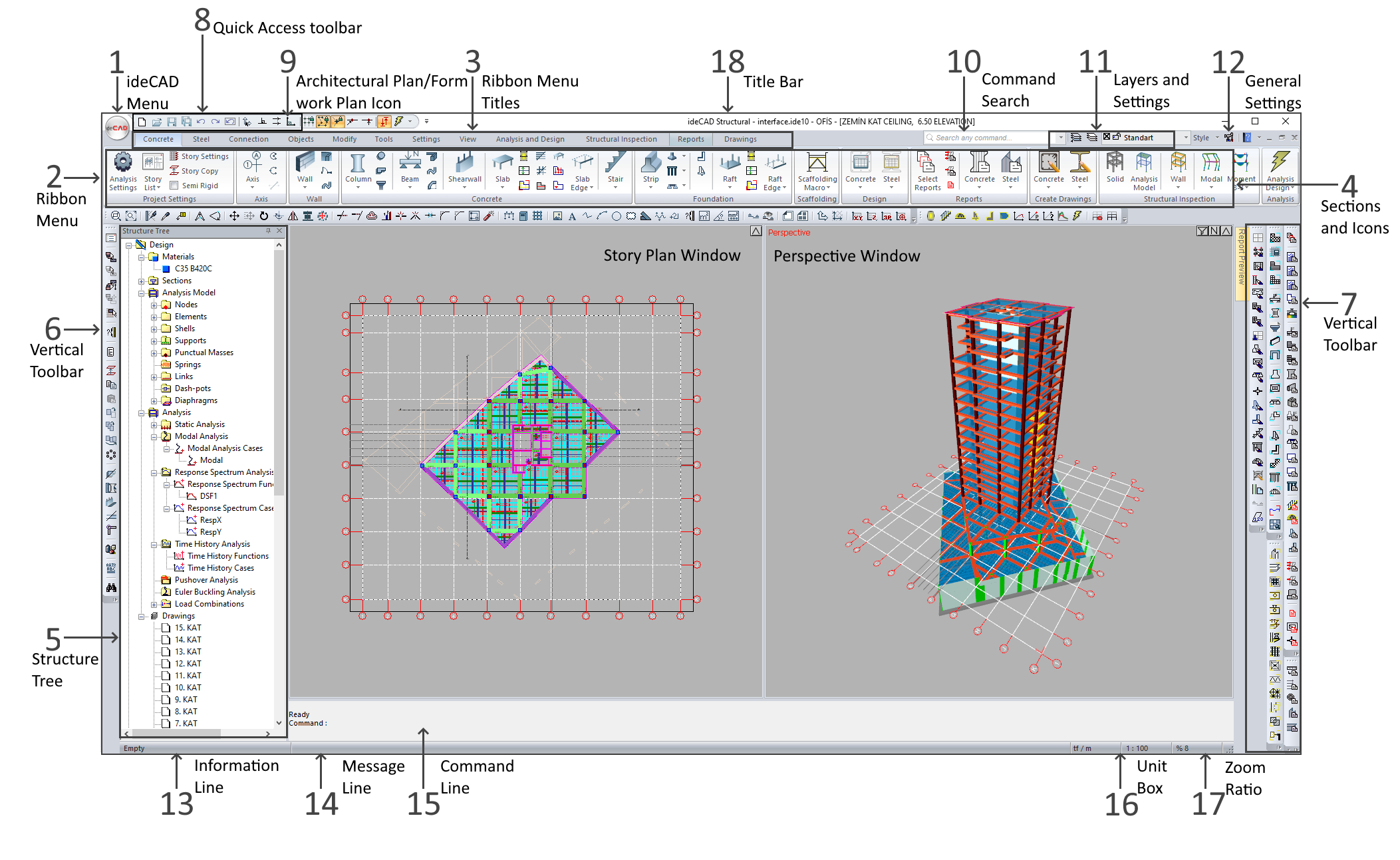 The display that opens when ideCAD is run is called the interface of the program. The interface includes sections such as menus, command icons and toolbars for the use of the program. It is aimed that the user can use ideCAD efficiently with sections such as message information line, structure tree, and vertical toolbar.
