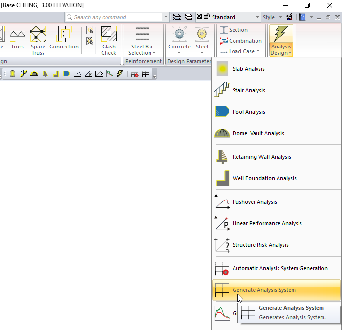 While analyzing+design is being done using the Analysis and Design (F9) command, the program automatically creates the analysis system and then performs the analysis+design.