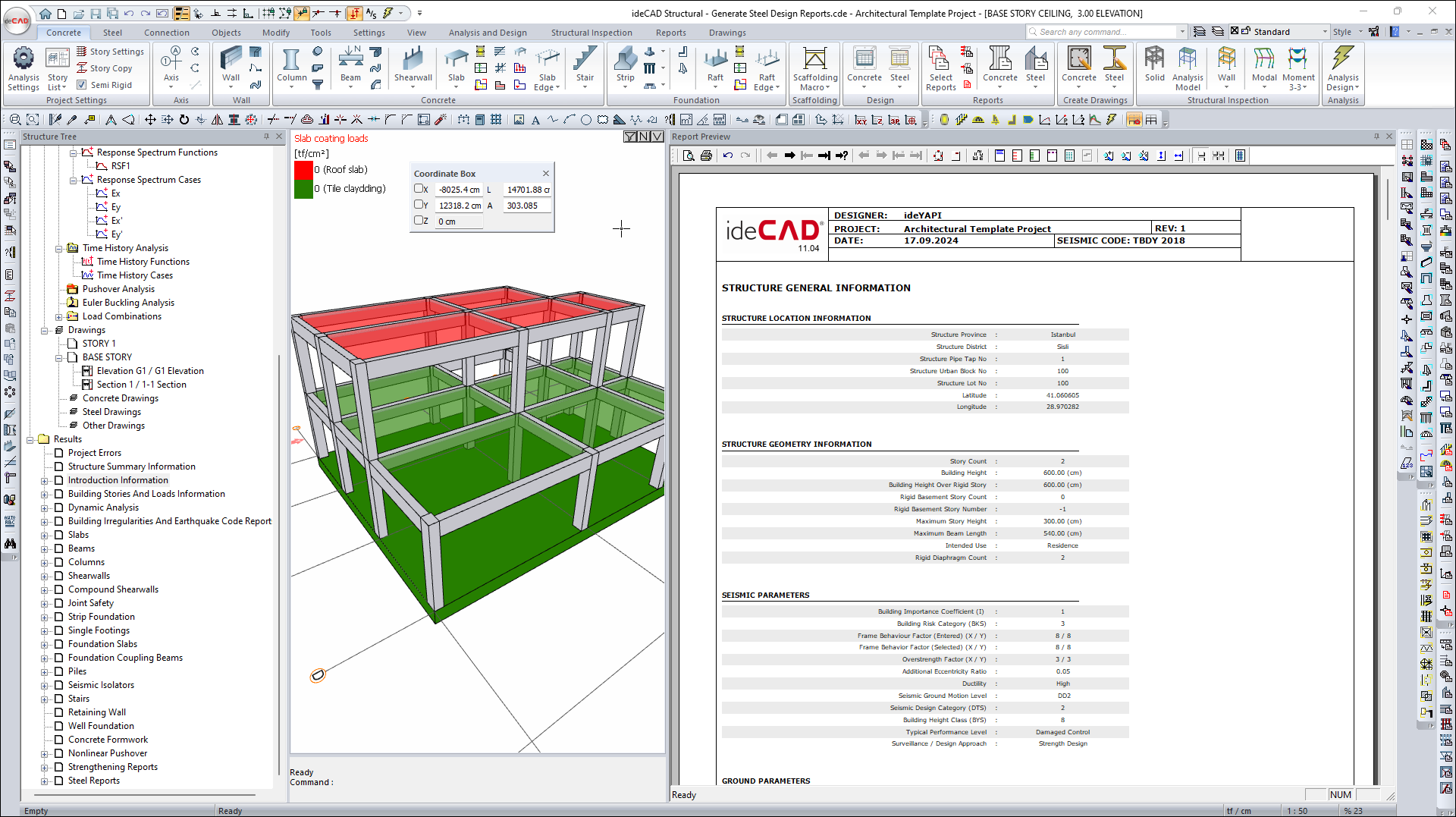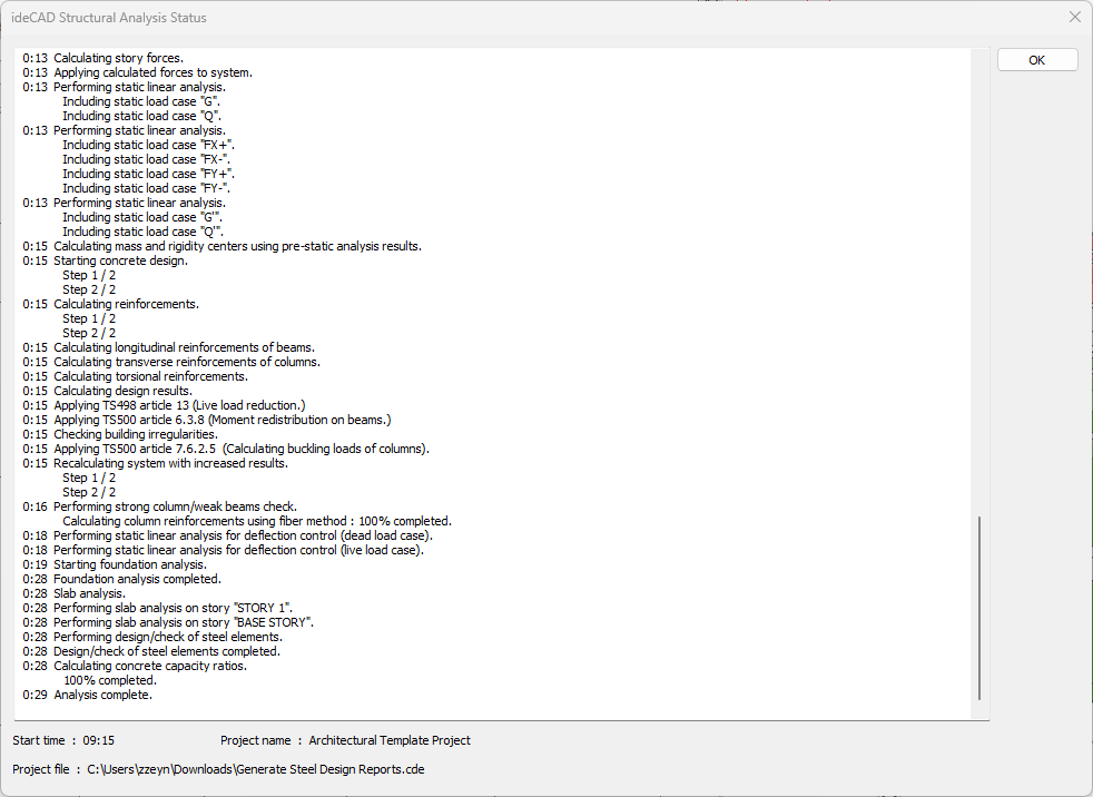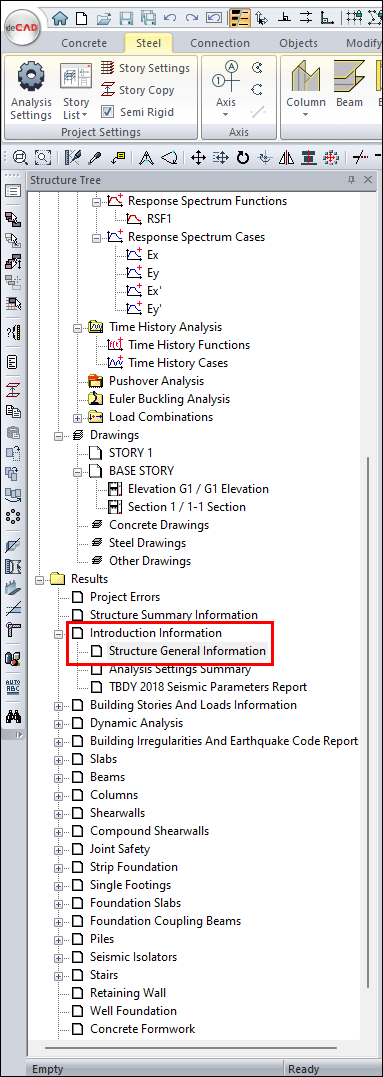 Generate TBDY, concrete and steel element reports of the project whose Analysis+Design is done. |