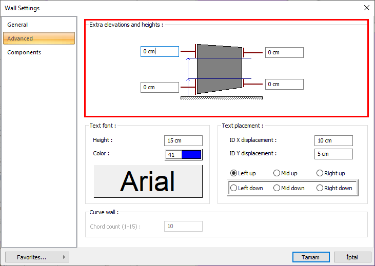 You can access the corner point elevation feature from the Advanced tab of the Wall Settings dialog .