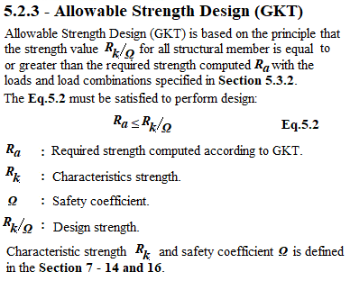 Allowable Strength Design is based on the principle that the strength value for all structural members is equal to or greater than the required strength calculated with the loads and loading combinations mentioned in the regulation. GKT uses the same average deviation value for all loads in load combinations.