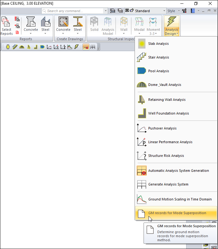 You can access the GM Records for Mode Superposition command under the Ribbon menu Analysis and Design tab Analysis heading .