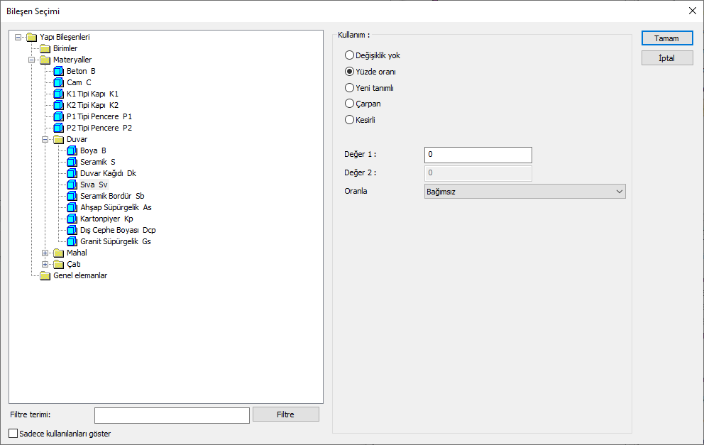 Percentage: This line is marked when it is desired to be used with the percentage of the amount previously determined in the material definition, as much as the value entered in the "Value 1" line in the same dialog. For example, if the material quantity is 70, if the line “Value 1” says 40, it means the material amount will be used up to 40 * 70%.