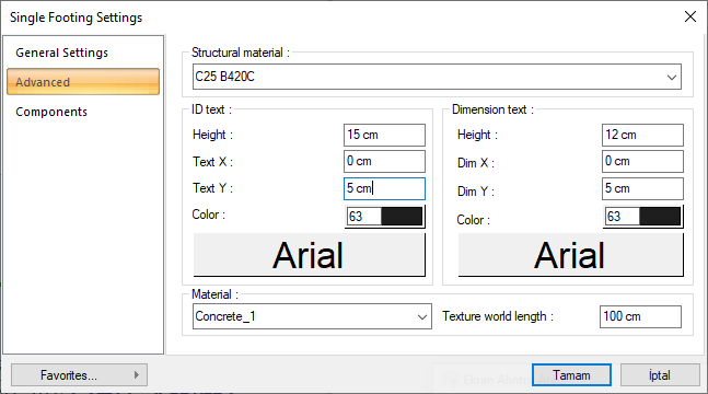 Text X/Text Y ![]() X and Y coordinates are entered according to the upper left corner of the column heading of the single footing ID text. Text If the X value is positive, the name text will move to the left, if it is negative, it will move to the right. Text scrolls up if the Y value is positive, and down if it is negative. |