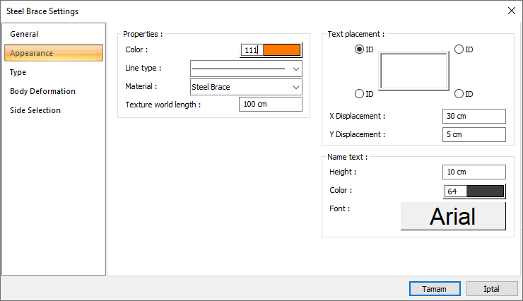 Name text ![]() The height of the brace name text is entered. The color box is slid over the color palette that is opened by clicking and holding down the button with the left mouse button. The button is released when the desired color is reached. The color box turns into the selected color. If clicked together with the Shift key, the pen thickness of the relevant color can be adjusted. If the button below is clicked, the Font Settings dialog opens. Beam Name Text, font type is set from this dialog. |