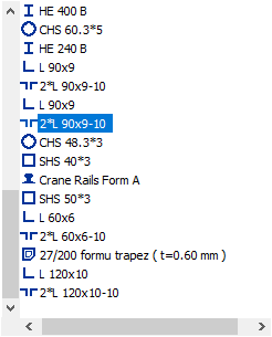 Sections ![]() All sections with the project added are listed. The wanted truss section is selected from the list and assigned to the truss elements. A section not included in the list is added to the list by using the load section button. |