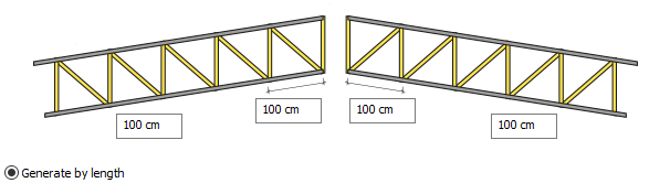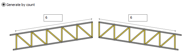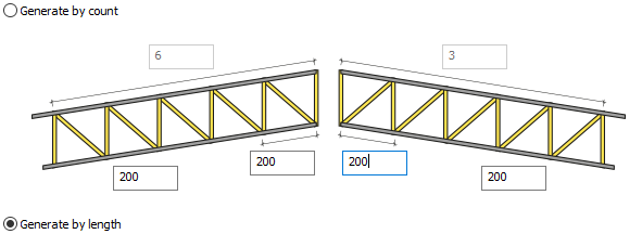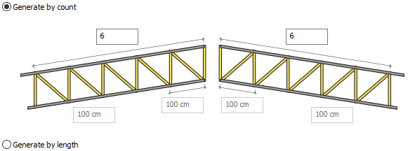 Generate by count ![]() The count of patterns for both slopes of the truss can be different. After selecting the option, give the values to determine the count of patterns for the left and right inclination. |