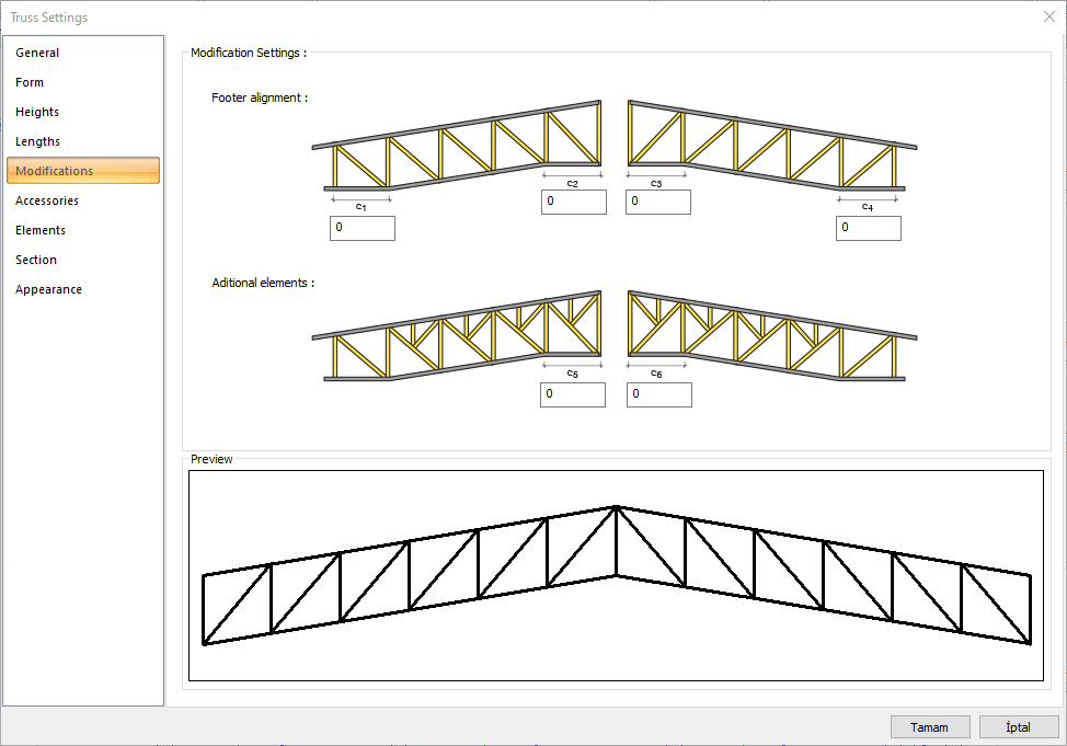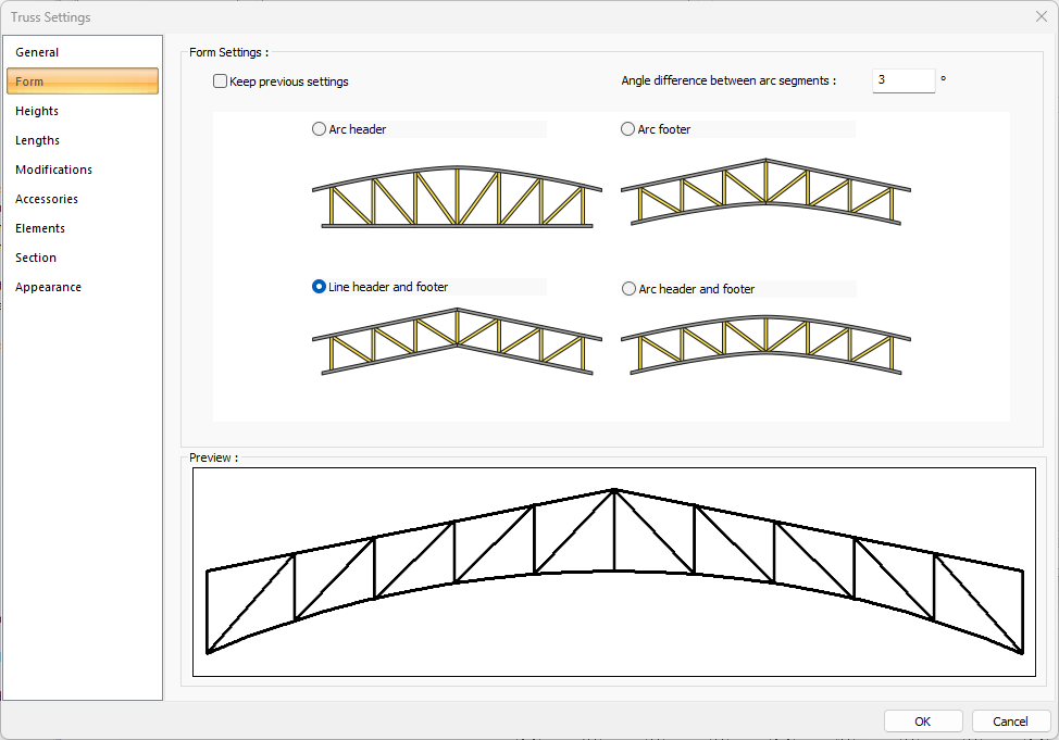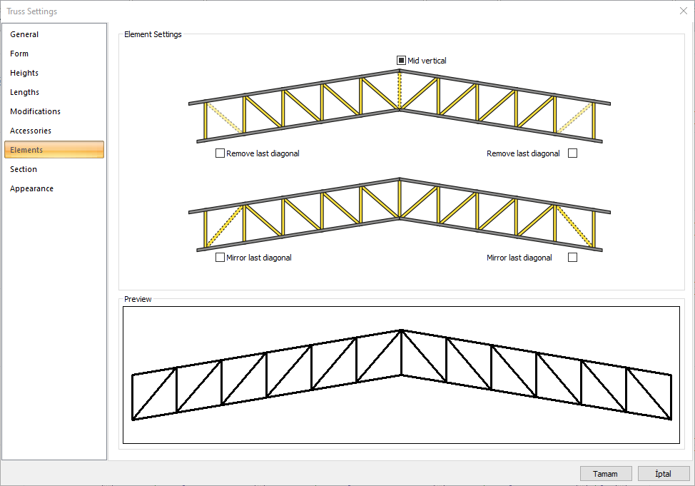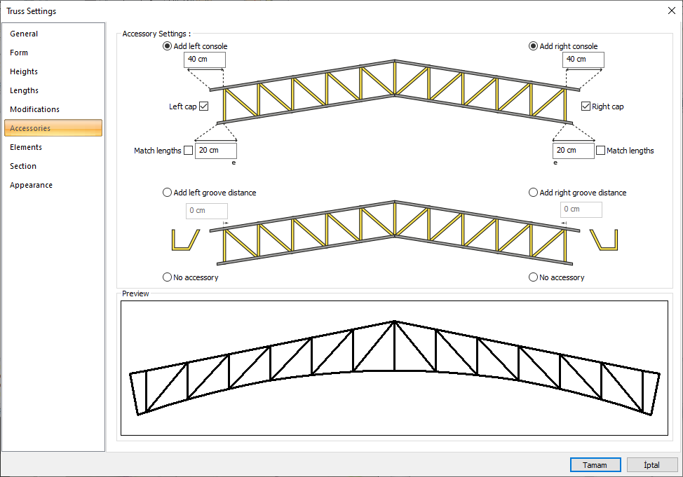 Preview ![]() Includes a preview of the trusses. The selected type and entered values can be followed simultaneously in the preview. |