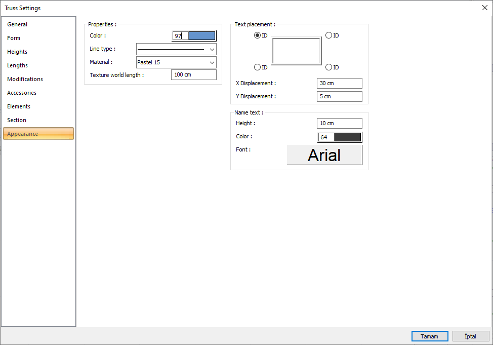 Name text ![]() The height of the name of the truss is entered. The color box is slid over the color palette that is opened by clicking with the left mouse button and holding down the button. The button is released when the desired color is reached. The color box turns into the selected color. If clicked together with the Shift key, the pen thickness of the relevant color can be adjusted. If the button below is clicked, the Font Settings dialog opens. Column Name Text, font type is set from this dialog. |