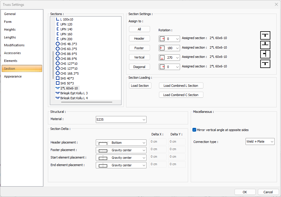 The truss elements of the section selected from the list from the profile section are assigned from this section. The selected section can be assigned to all truss elements by clicking the All button, and only the section can be assigned to that element by clicking one of the header, footer, vertical and diagonal buttons. |