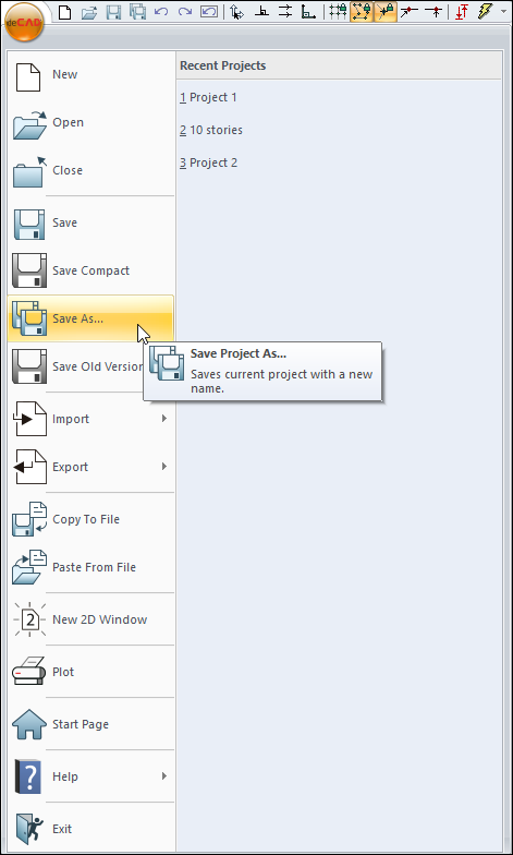 You can access the Save As command from the menu under the ideCAD logo located in the upper left corner of the screen in the ribbon menu.
