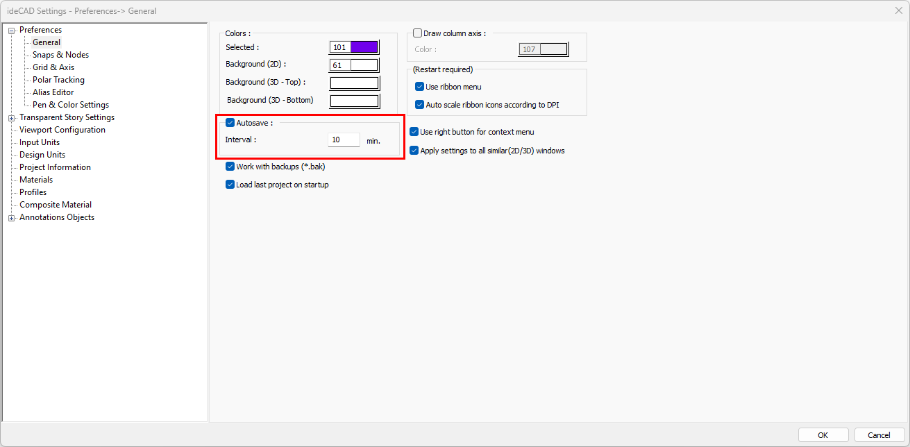 If it is not active, check the Autosave line and enter a value in minutes in the interval. Otherwise, backups of your project will not be created.