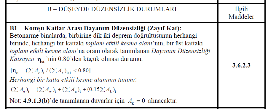 B1 Strength irregularity between adjacent floors In reinforced concrete buildings, in either of two perpendicular earthquake directions, Strength Irregularity Coefficient ηci , defined as the ratio of the total effective shear area on any floor to the total effective shear area on the next floor , is less than 0.80. is the case