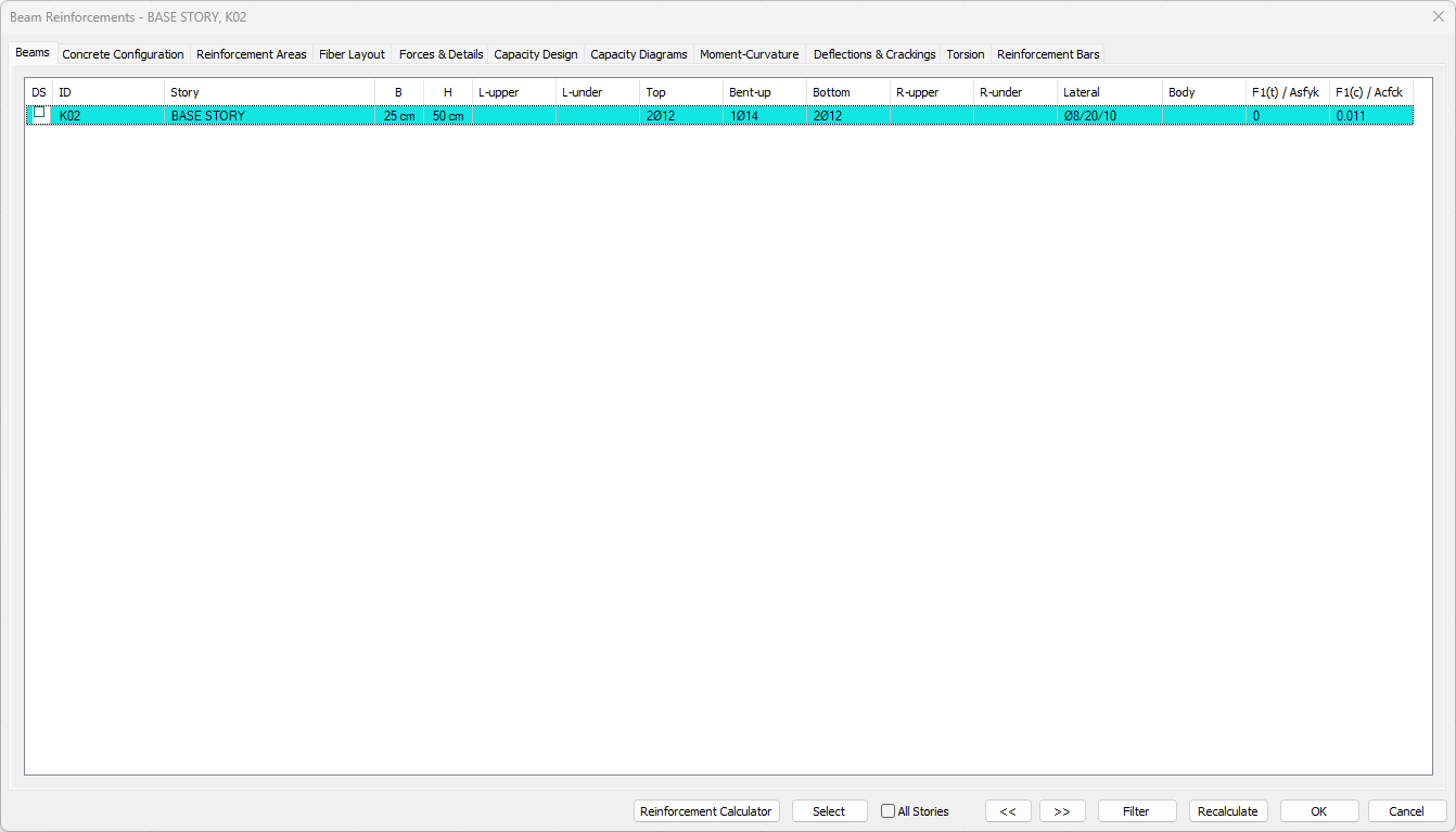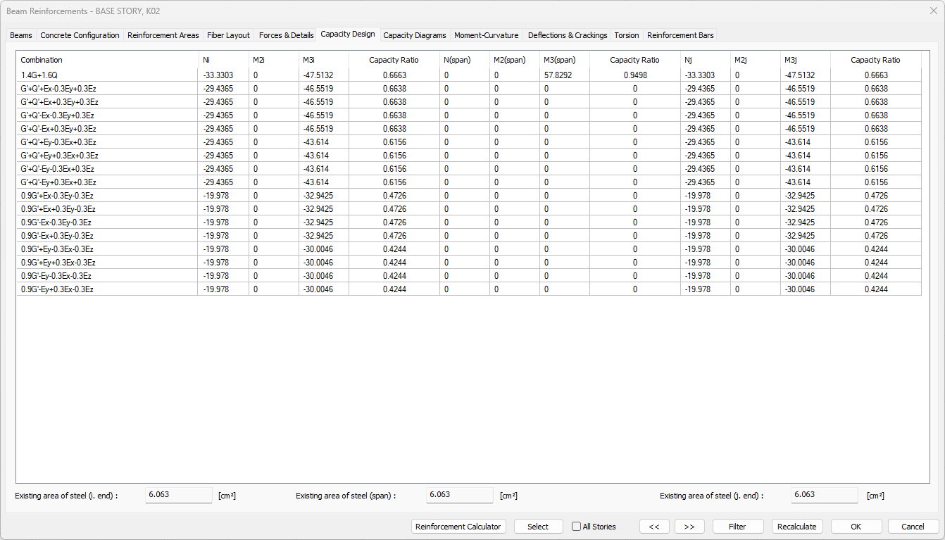 Detailed information of the capacity ratios in beams can be seen in the Capacity design tab of the Beam Reinforced Concrete window . Using this section, it can be seen in which section of the beam, under which combination effect, the capacity ratio is exceeded and can be intervened appropriately.