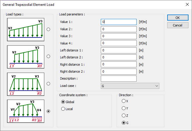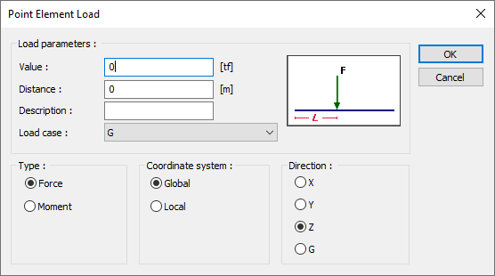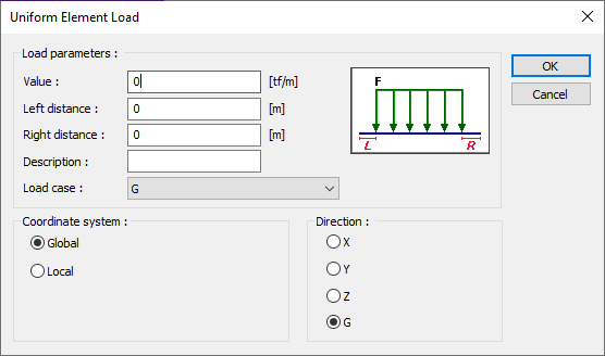 Direction ![]() Give information in which direction the load is valid. Shows the direction of the load according to the X, Y, Z global coordinate system, 1, 2, 3 local coordinate axes. G indicates that this load is a constant (vertical) load. |