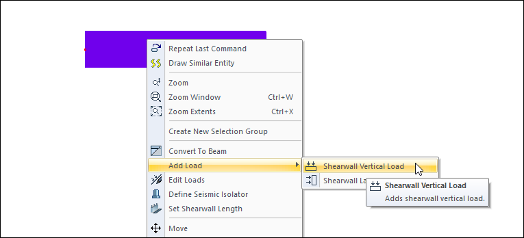 From the menu that opens, go to the Add Load line and click the Shearwall Vertical Load line from the submenu.