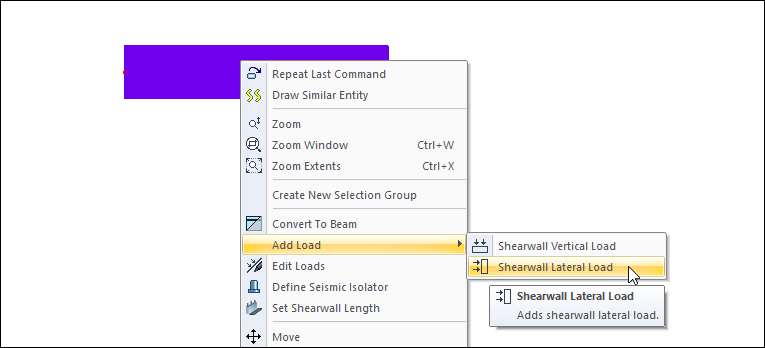 Go to the Add Load line from the menu that opens and click the Shearwall Lateral Load line from the submenu.