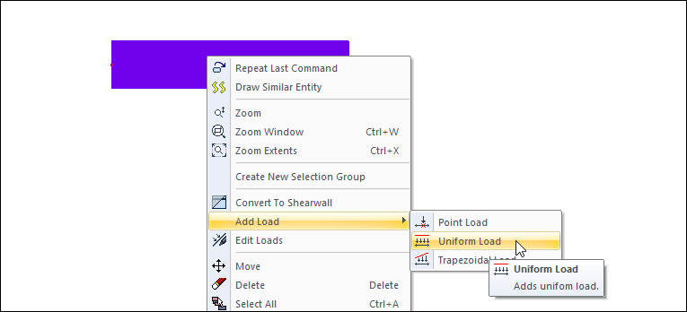 From the menu that opens, go to the Add Load line and click the Uniform Load line from the submenu.