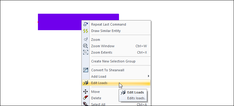 After selecting the element you want to define external load on the plan window, click the right mouse button on the element.