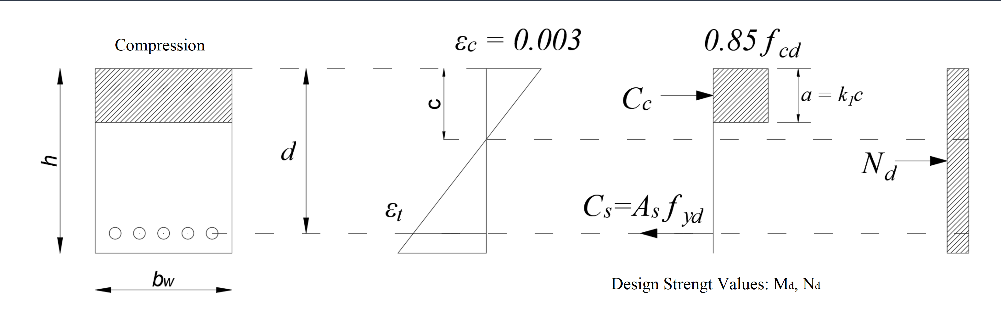 The assumptions made in the calculation of the design forces under the effect of axial compression and biaxial bending calculated using the equivalent rectangle method are shown below. In the picture below, the calculation acceptance of a section under the influence of axial force and uniaxial bending is shown schematically. In ideCAD Structural, this calculation is made under the effect of axial force and biaxial bending.