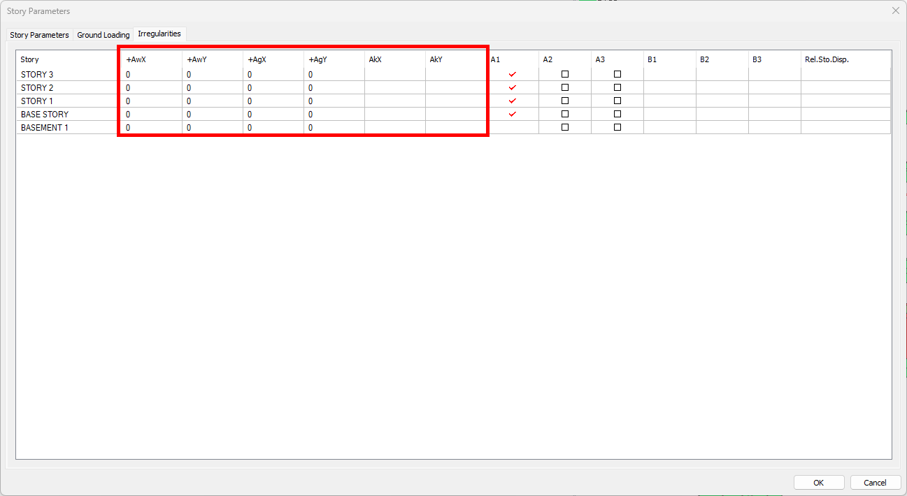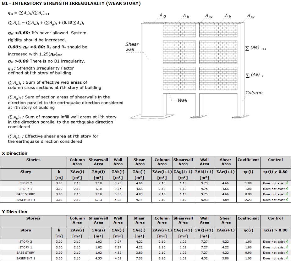 B1 (Weak Story) Irregularity occurs when the effective cutting area in a story is less than the value specified in the regulation when compared to an upper story. The variables in the cutting area are shearwall, column and walls (nci). Effective cutting areas are automatically calculated according to the load-bearing system and wall-wall loads entered in the program, and the values are printed in the general report of the earthquake regulation.