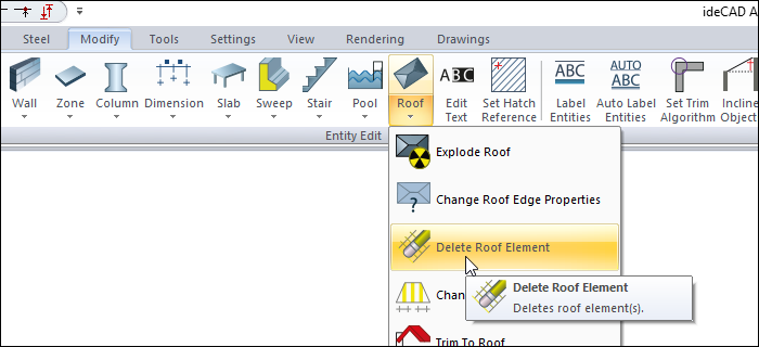 Click the Delete Roof Element icon in the Entity Edit title of the Modify tab in the ribbon menu.