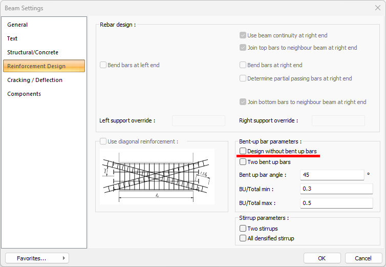 Click the beam command and open the Beam Settings with the Settings icon in the beam toolbar. Click the Design without bent up bars option in the Steels tab.