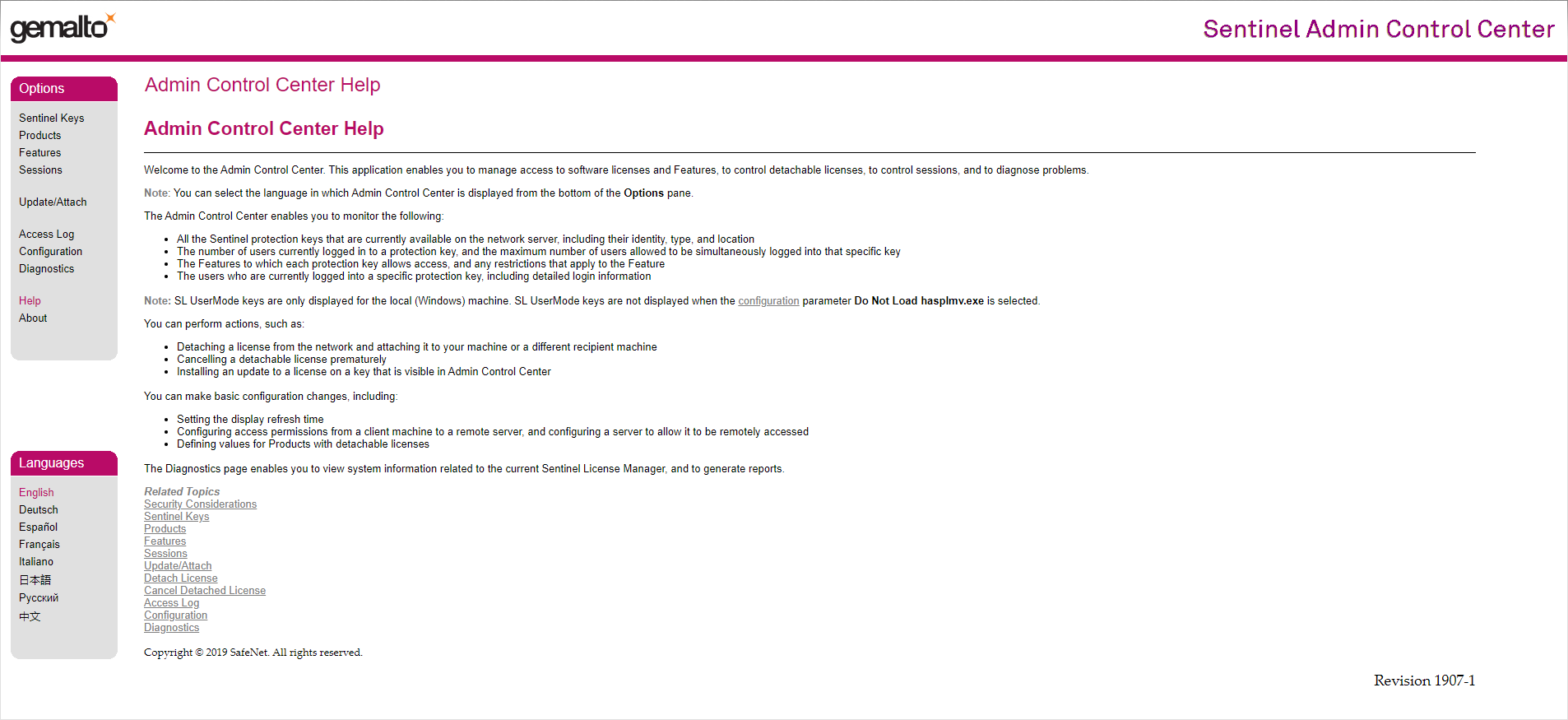 The Admin Control Center Help window will open. This window contains information about the dongle.