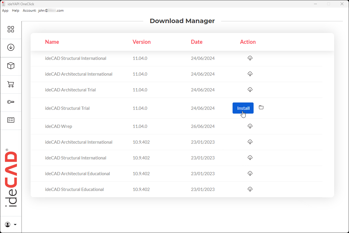 From the download manager tab, you can access the ideCAD applications and versions to be downloaded.