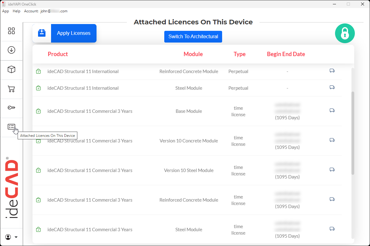 With ideYAPI OneClick, ideCAD applications are downloaded and ideCAD programs installed on the current computer are displayed.