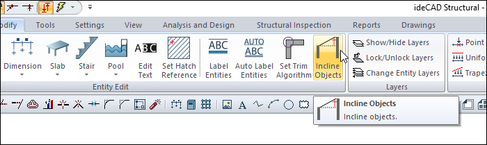 The inclined system is defined by giving the slope direction to the object with the incline objects command. The elevation of beams and columns changes automatically. The defined system is followed from the 3D view.