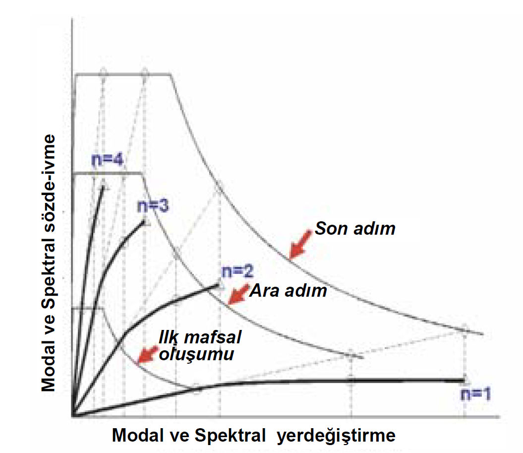 In this relation (n) is the number of modes, shows the incremental scale coefficient which is constant for all modes in step (i). It is the elastic spectral displacement of the nth mode in the first repulsion step (linear elastic case) from S (1) . Detailed explanation of the method will be made. Here, modal scaling is done for each mode and the basis of this scaling is "equal displacement rule". In this rule, it is assumed that nonlinear spectral displacement is equal to elastic spectral displacement. The figure below shows a representative graph of the Modal and Spectral substitutions for each mode scaling at each impulse step of the spectral pseudo-acceleration plots derived from the horizontal elastic design spectrum.