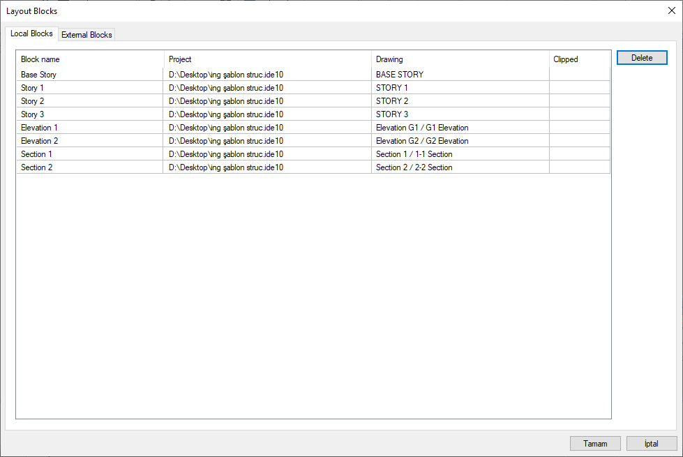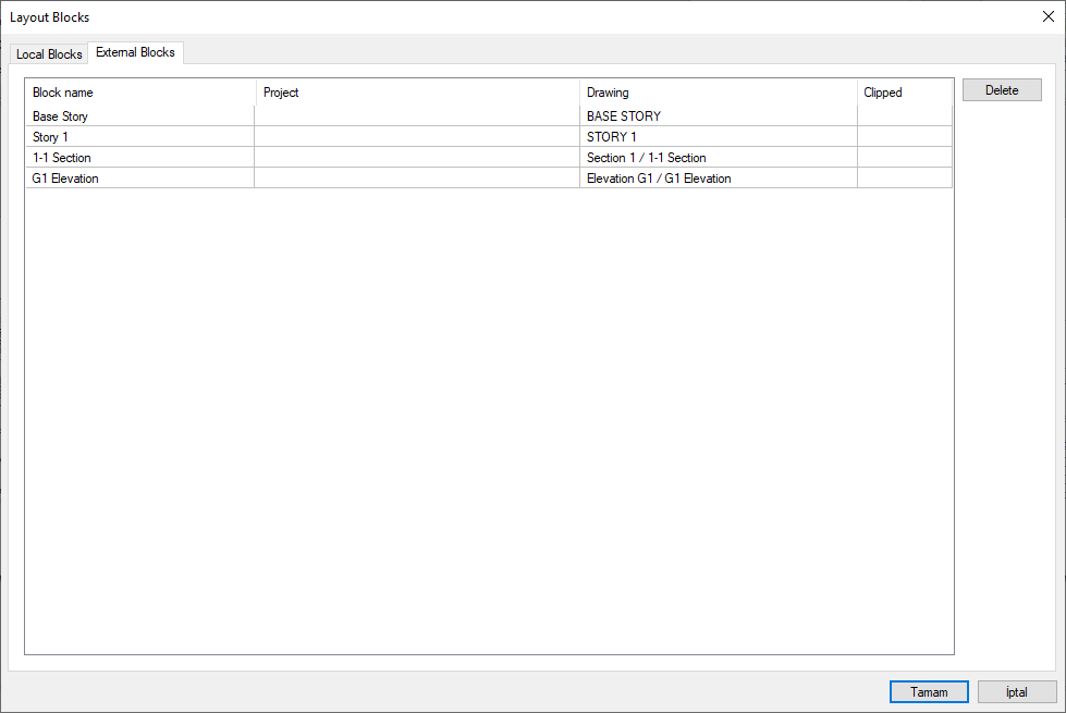 The blocks saved in the program are listed. There are layout blocks from different projects.