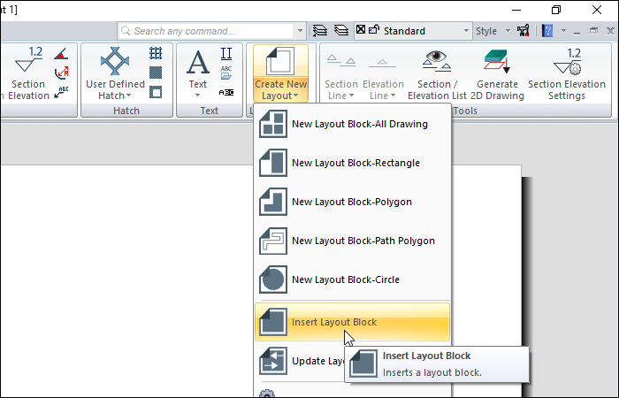 Layout blocks, that are created with the create new layout block commands, are placed in the drawing area with Insert Layout Block command.