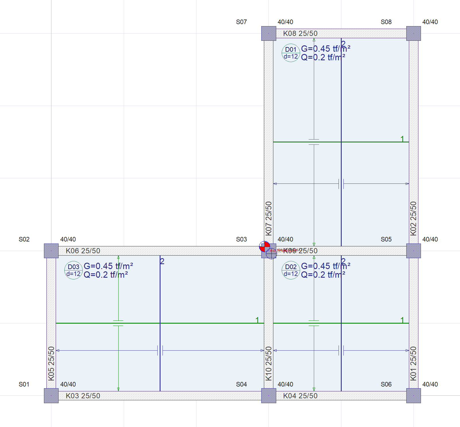 In the structure whose plan view is given in the image below, the instantaneous deflection calculation will be made for the K06 beam and compared with the ideCAD results. For the K06 beam, instantaneous deflection under the effect of live loads (Q) and instantaneous deflection and time-dependent deflection calculations for Dead Loads (G) will be made. The results will be compared with ideCAD v10 by calculating the total deflection from the deflections consisting of fixed and live loads.