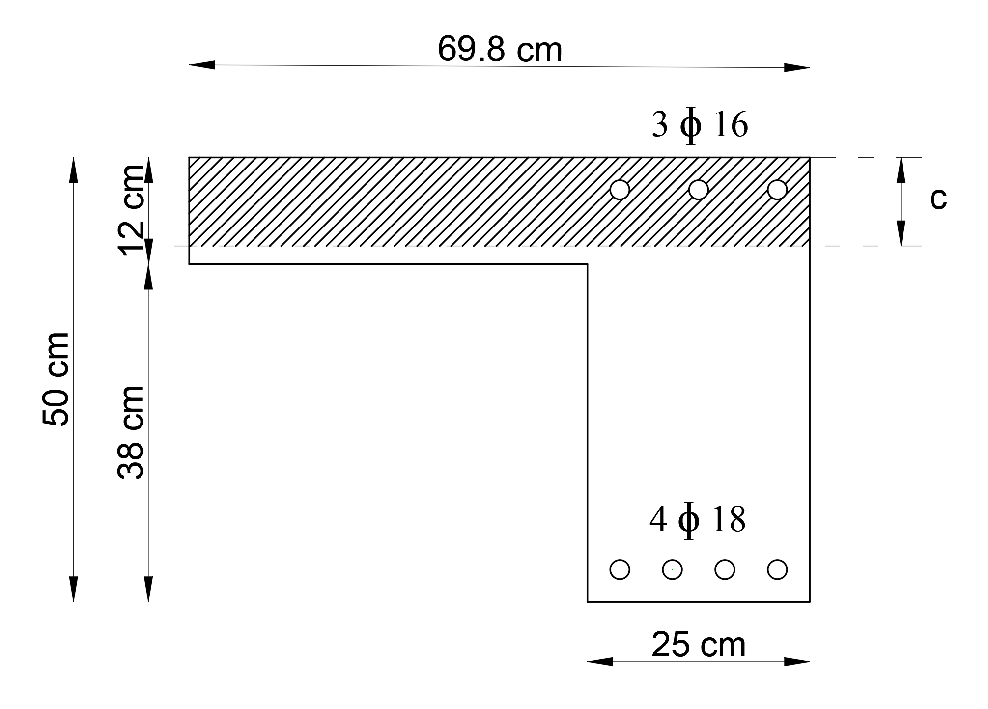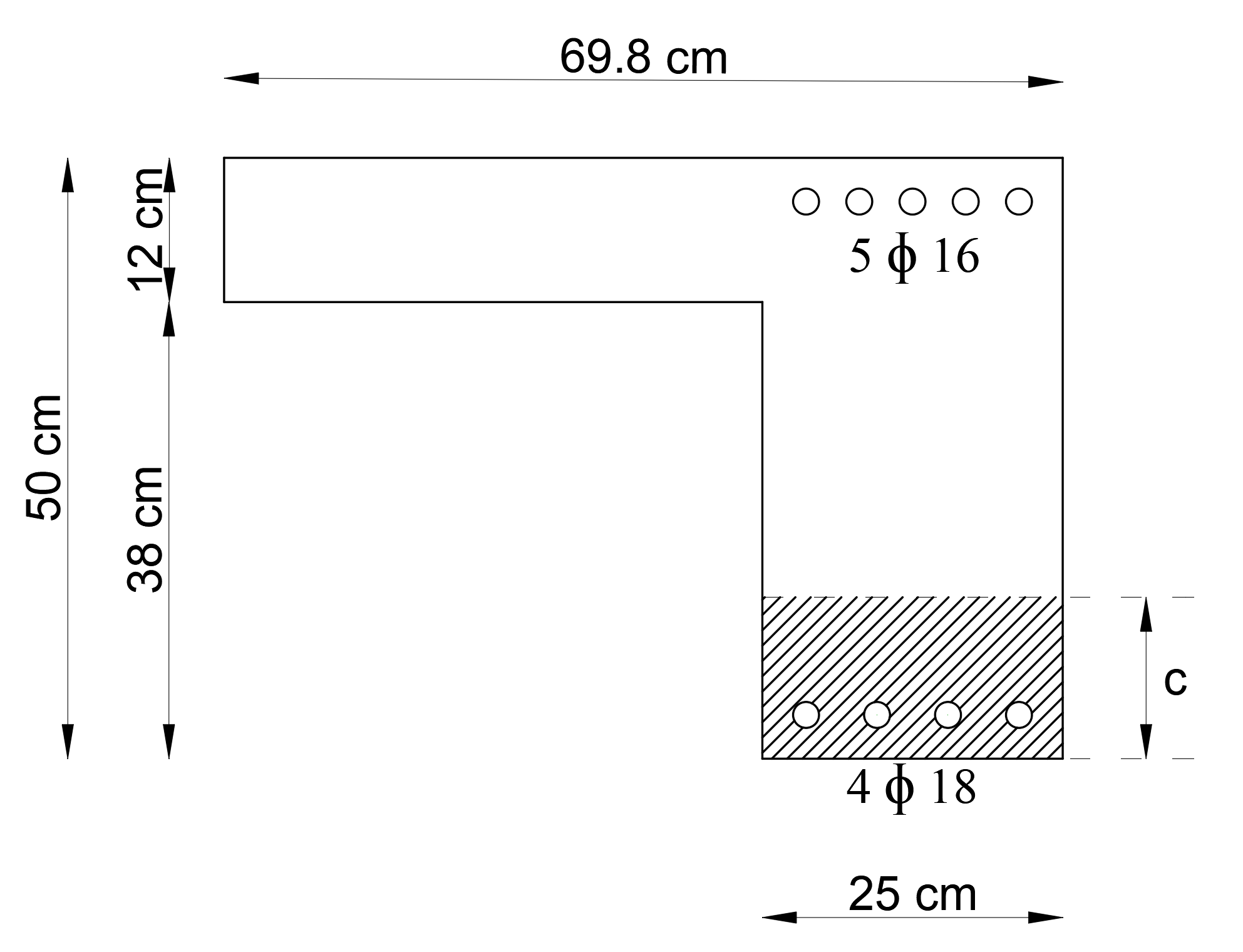 In the calculation of the moment of inertia of the cracked section, the compression zone of the section and the reinforcement placement are taken into account. The figure below shows the right end region for the opening region and the concrete compression region and reinforcement placement.