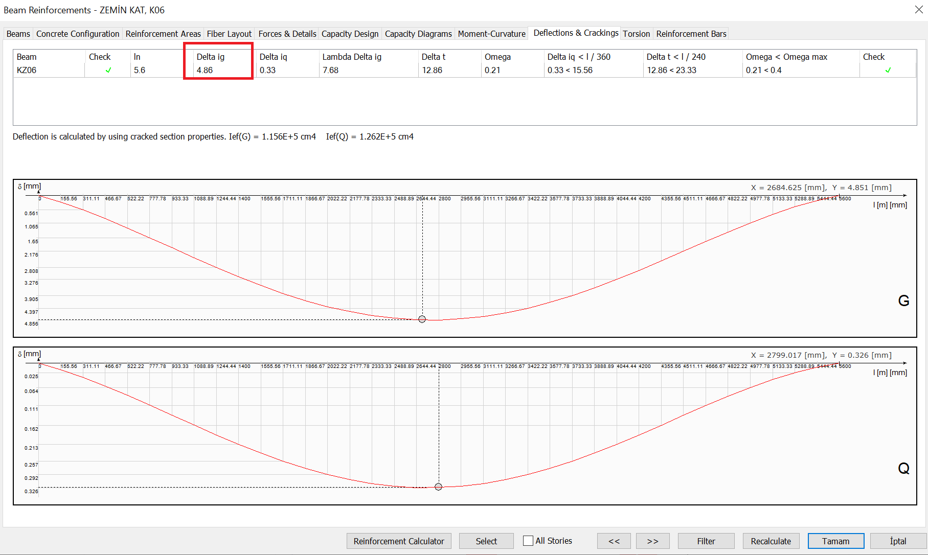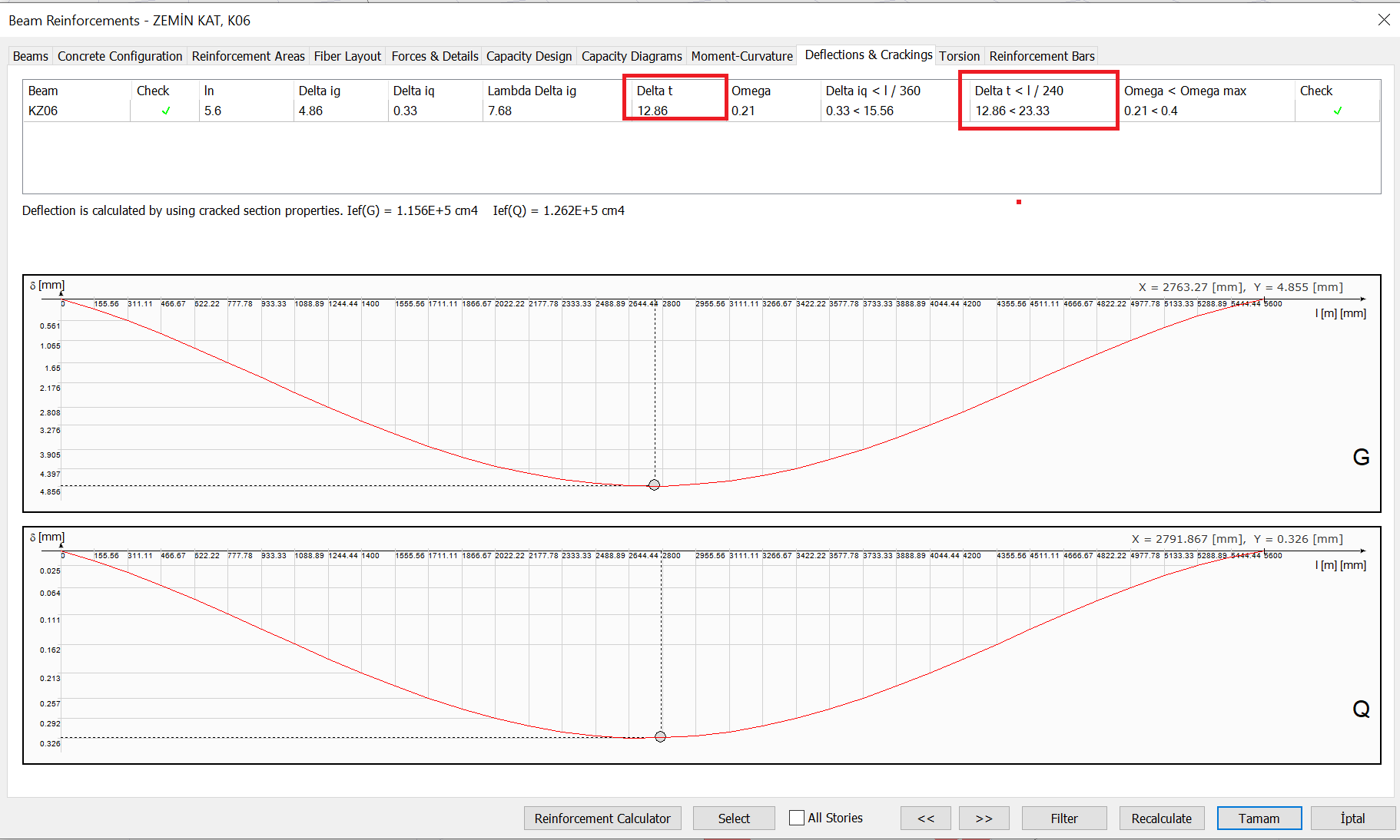 The deflection results of the K06 beam under the Live Load (Q) effect in the Beam Reinforcement window are shown below.