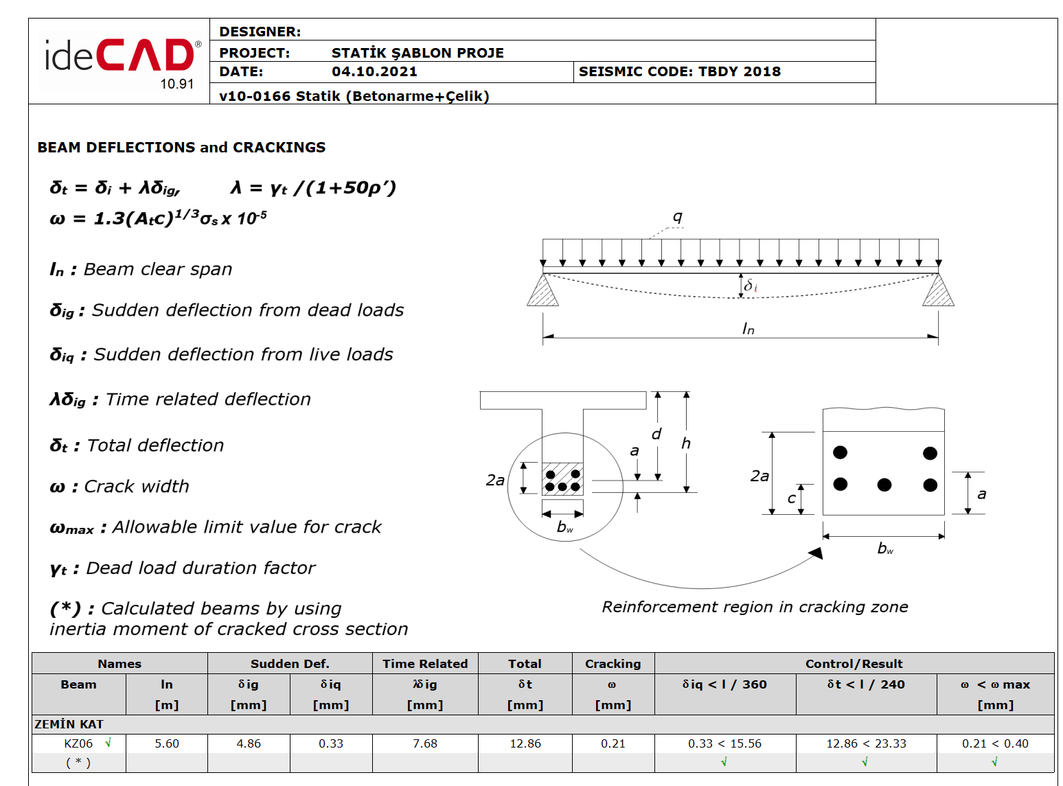 The results calculated above can also be checked in the Beam Deflections and Crackings Report .