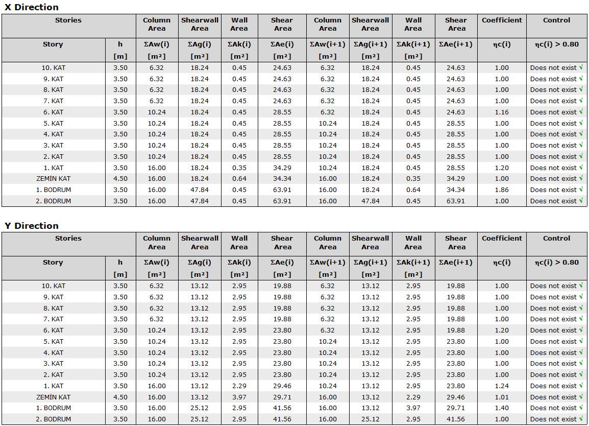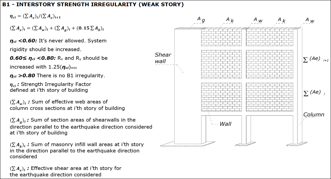 Interstory Strength irregularity, B1, defined as Strength Irregularity Coefficient ηci should be less than 0.80, which is defined as the ratio of the total effective shear area on any floor to the total effective shear area on the next floor in either of two perpendicular earthquake directions in reinforced concrete buildings. The Interstory Strength Irregularity Coefficient ηci is defined as follows.