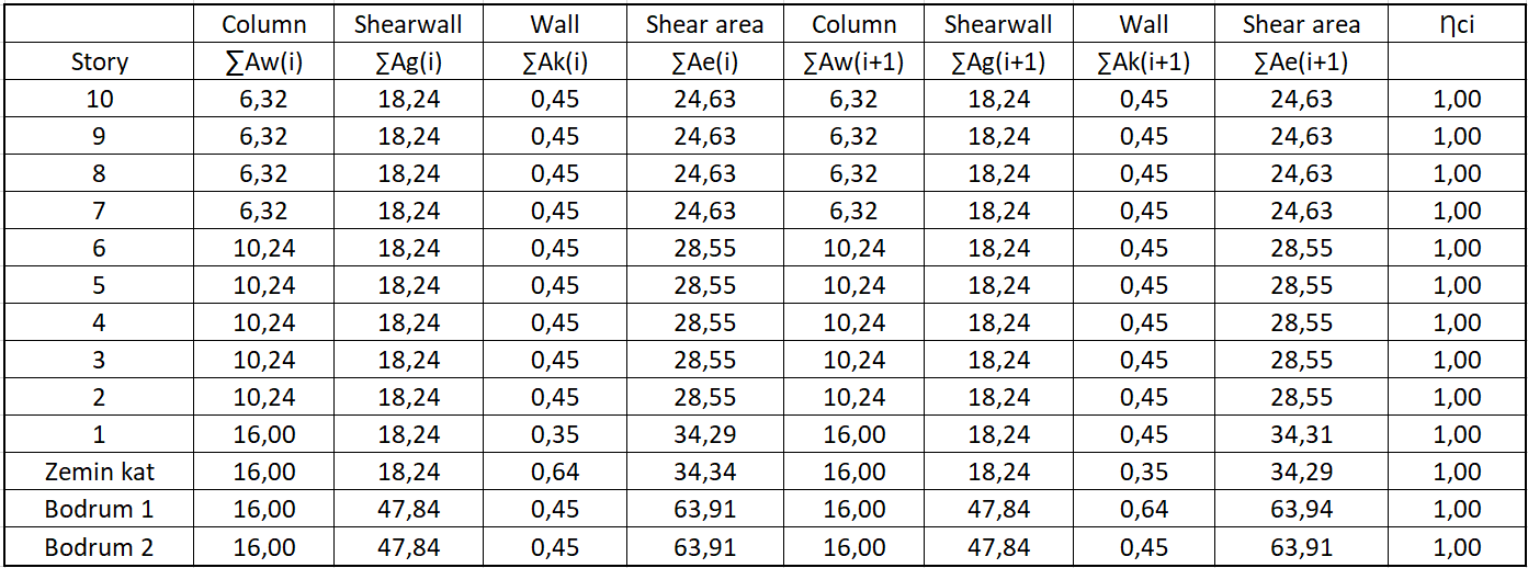 If this calculation is to be controlled manually, firstly, the areas of columns, and shearwalls must be determined on each floor. To be detailed with an example for the X direction;