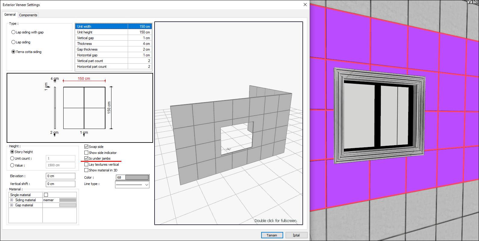 When the "Is under jambs " option in the settings of the exterior veneer command is selected, it extends the siding element under the jamb element, up to the window/door gap. If not marked, finish the exterior veneer on the edge of the jamb, surrounding the jamb.